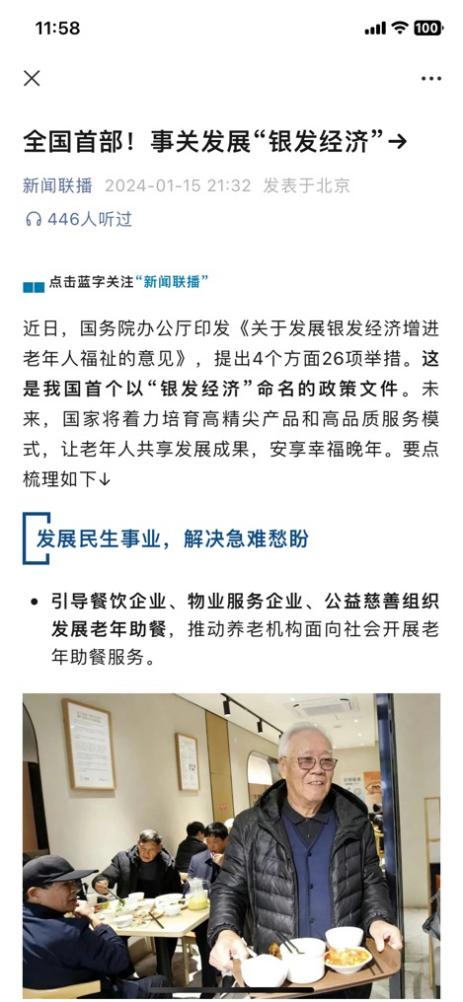 据央视新闻联播1月15日报道,近日,国务院办公厅印发《关于发展银发经济增进老年人福祉的意见》(以下简称《意见》)。这是国务院办公厅印发首部以银发经济命名的政策文件,可视为银发经济元年。